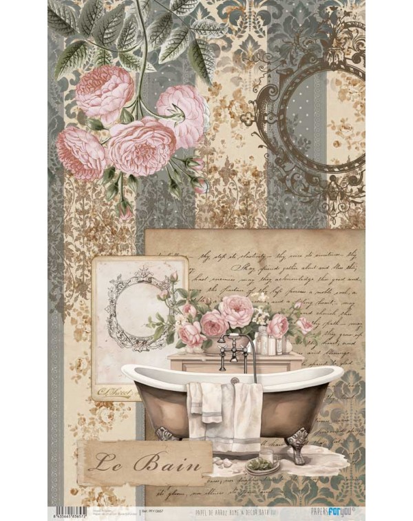 Papel de arroz decorado  con un gramaje muy bajo cuya ligereza y adaptabilidad a casi cualquier superficie lo hace apto para cualquier técnica de decoupage. Permite forrar tanto por el interior como del exterior en superficies planas y redondas. Sobre el cristal es posible mantener la transparencia, sobre tela mantener la suavidad y sobre el mobiliario permite decorar el forro interior.