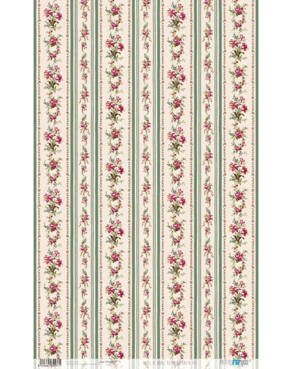 Papel de arroz decorado con un gramaje muy bajo cuya ligereza y adaptabilidad a casi cualquier superficie lo hace apto para cualquier técnica de decoupage. Permite forrar tanto por el interior como del exterior en superficies planas y redondas. Sobre el cristal es posible mantener la transparencia, sobre tela mantener la suavidad y sobre el mobiliario permite decorar el forro interior.