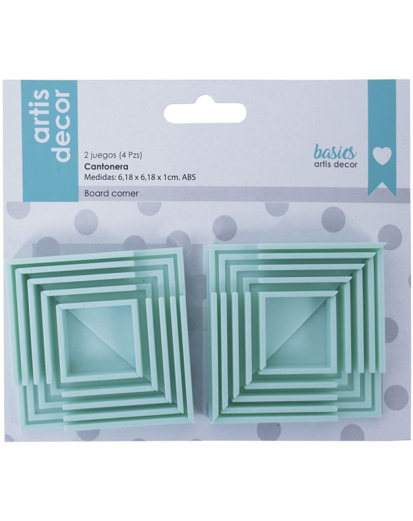 Pack de 4 cantoneras una con base y otra sin base, en color verde, cada cantonera cuenta con diferentes medidas para adaptarse al grosor del cartón : 1,5mm, 2mm, 2,5mm y 3mm.