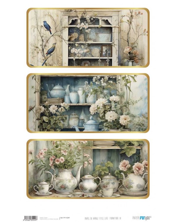 Papel de arroz decorado con un gramaje muy bajo cuya ligereza y adaptabilidad a casi cualquier superficie lo hace apto para cualquier técnica de decoupage. Permite forrar tanto por el interior como del exterior en superficies planas y redondas. Sobre el cristal es posible mantener la transparencia, sobre tela mantener la suavidad y sobre el mobiliario permite decorar el forro interior.